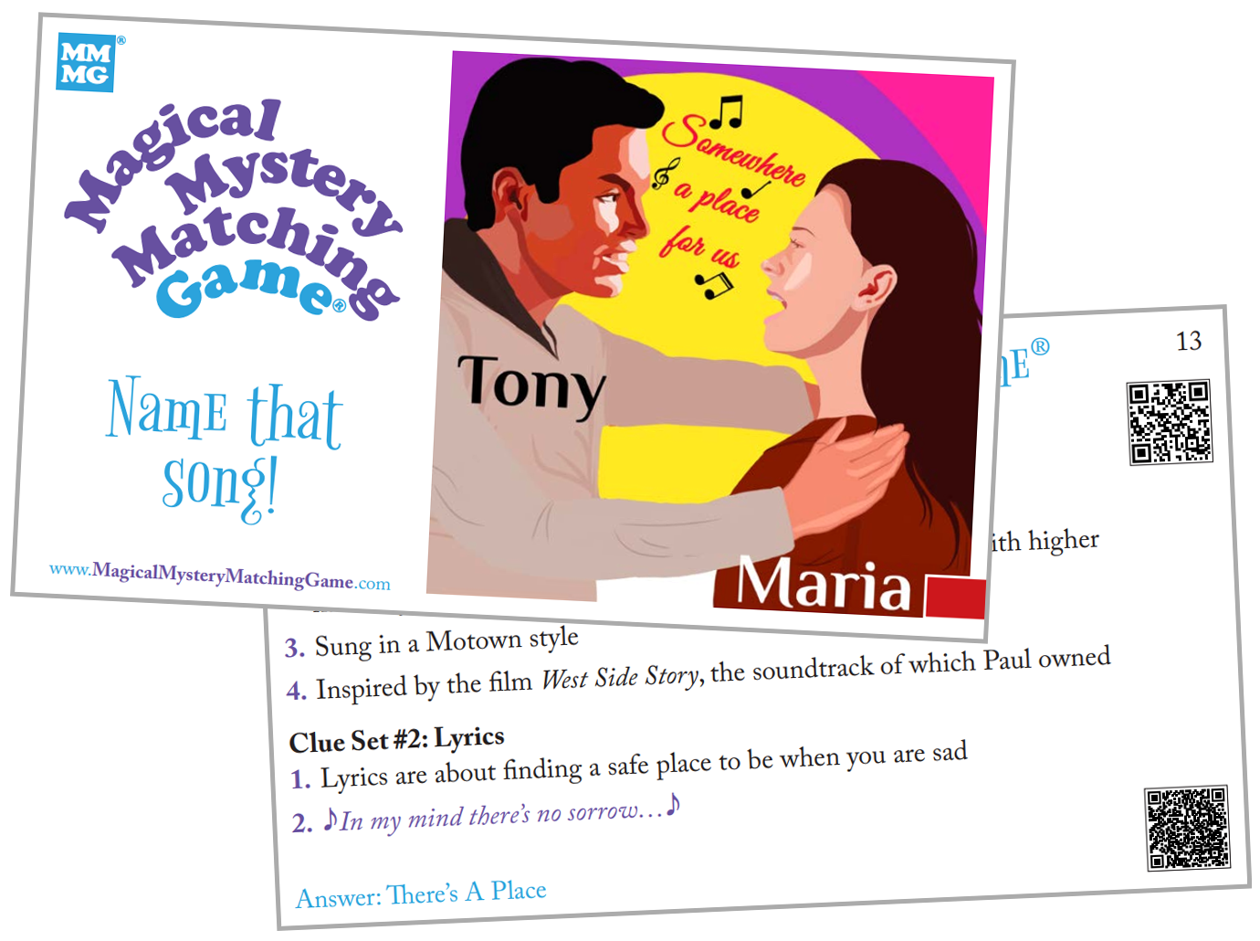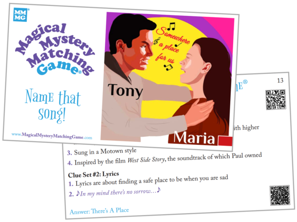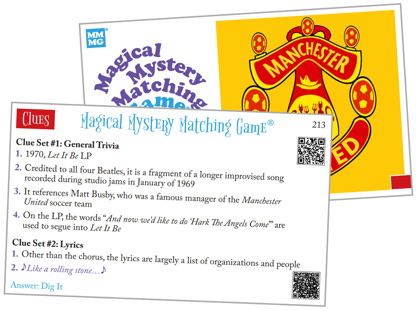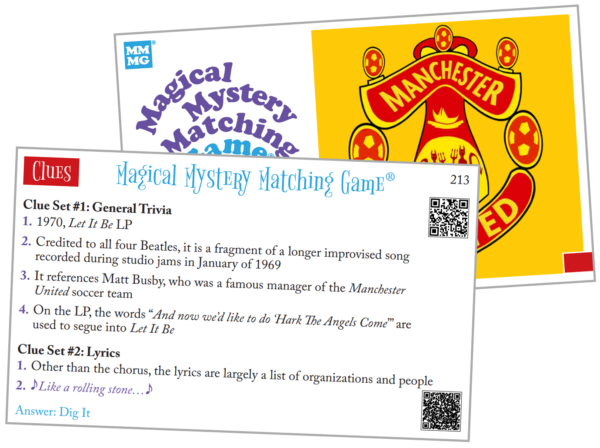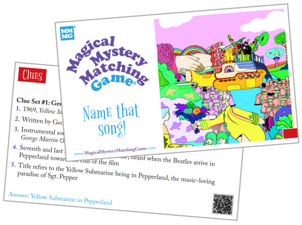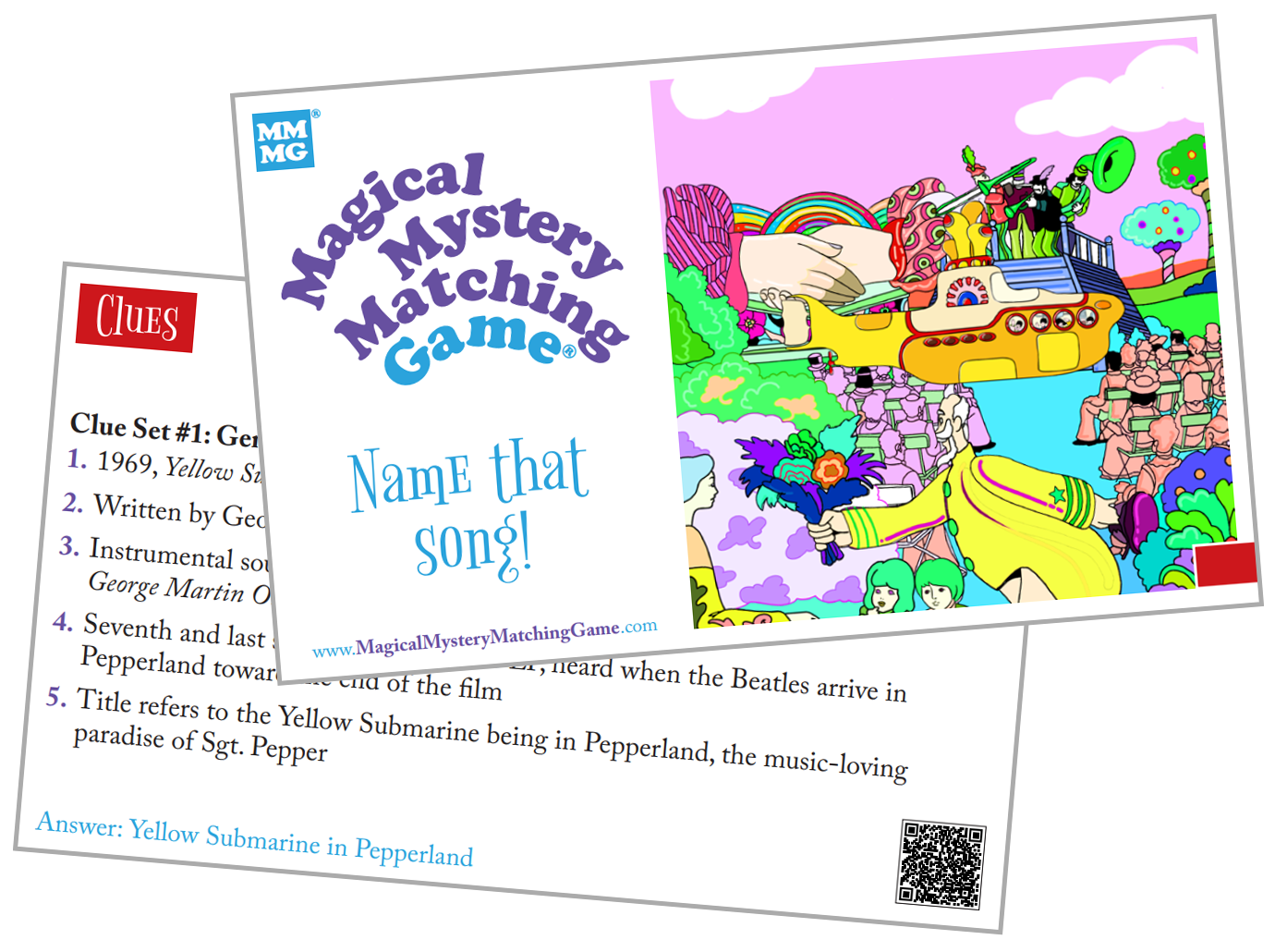 The MMMG Red Image Card pack contains 45 cards, each one having an image on one side that corresponds to a Beatles song, and written clues on the back of the card. The Red Image Cards are the “very challenging” clues.